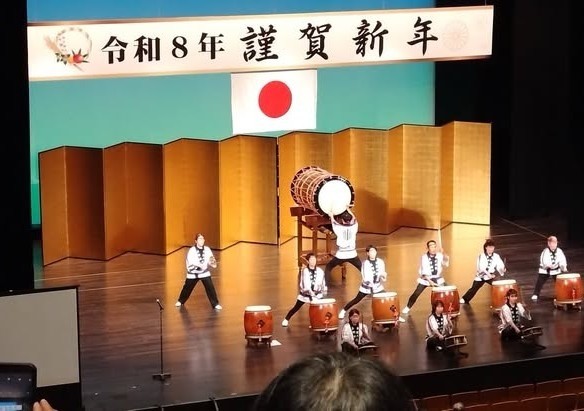 日近太鼓のアトラクションのあと主催者や来賓の年頭のあいさつ等を行い、年の初めを祝いました。