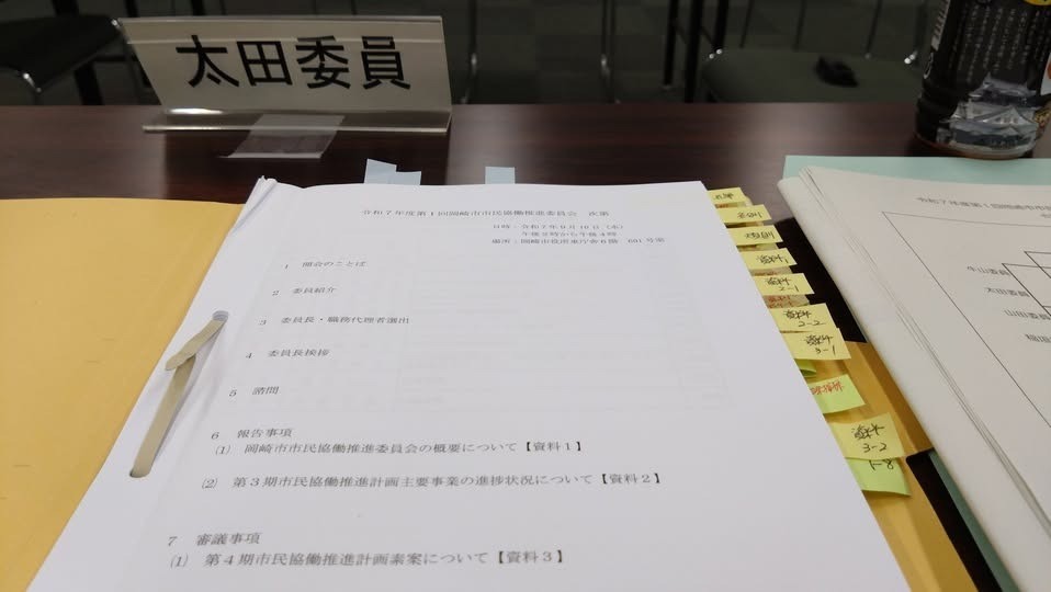 9/10(水) 岡崎市役所 東庁舎で「令和7 年度第 1 回岡崎市市民協働推進委員会」があり、委員として出席し、下記事項を審議しました。