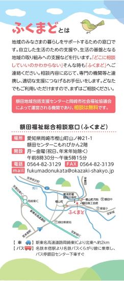 福祉総合相談窓口(愛称:ふくまど)は、額田のみなさんが住み慣れた場所で、安心していきいきと生活